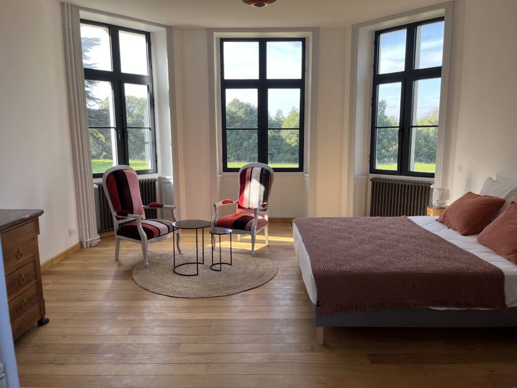 Située au premier étage du manoir, la Chambre des Mariés allie élégance et confort. Spacieuse et lumineuse, elle présente un parquet massif en chêne, une cheminée d’époque et un mobilier contemporain soigneusement sélectionné. Sa vue plongeante sur le parc offre une atmosphère paisible et reposante.